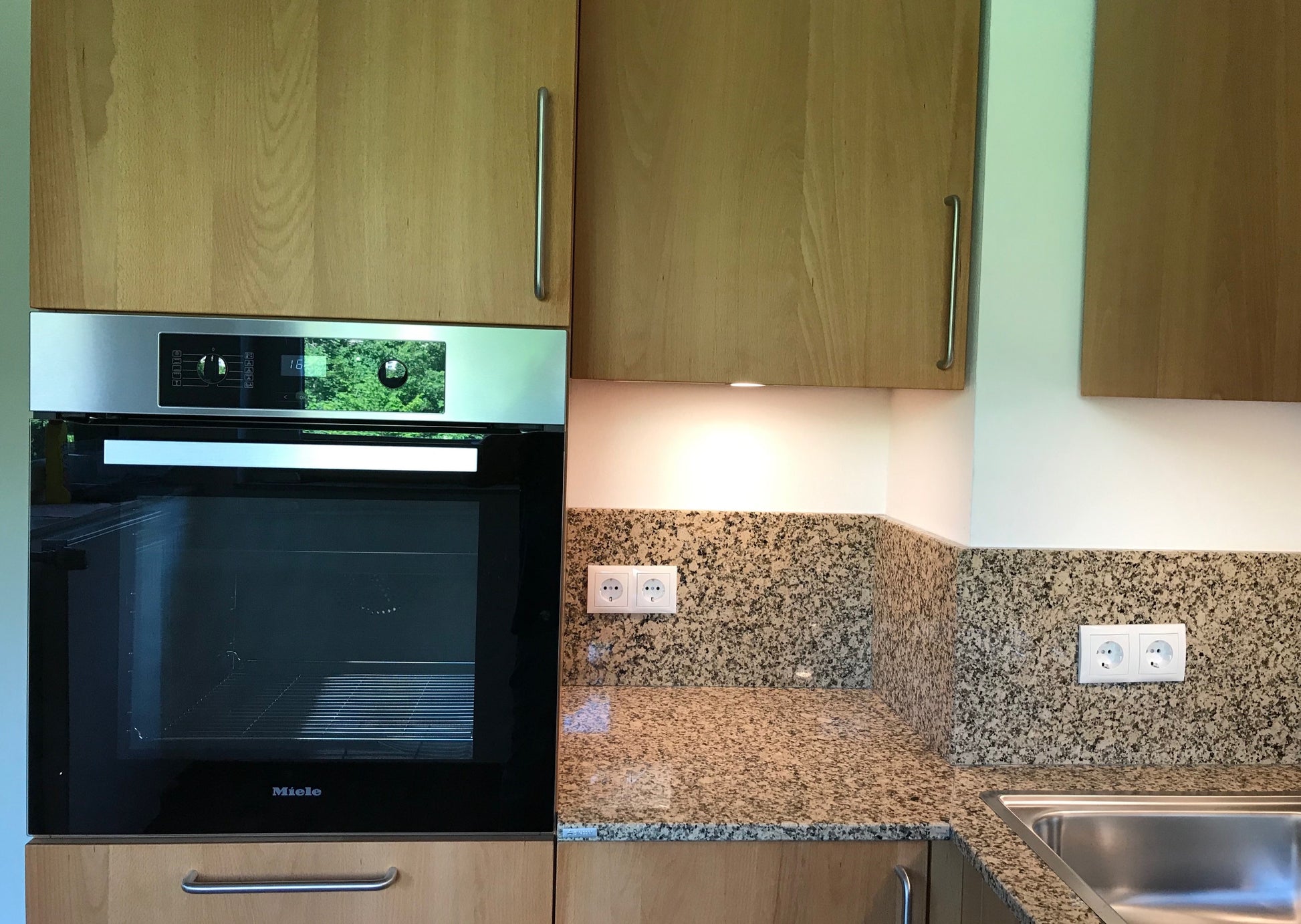 Küche: Korpus in Tischlerplatte und Front in massiver 3-Schicht; Arbeitsplatte Granit, diesmal in nur 2 cm und Geräte mit Edelstahlblende